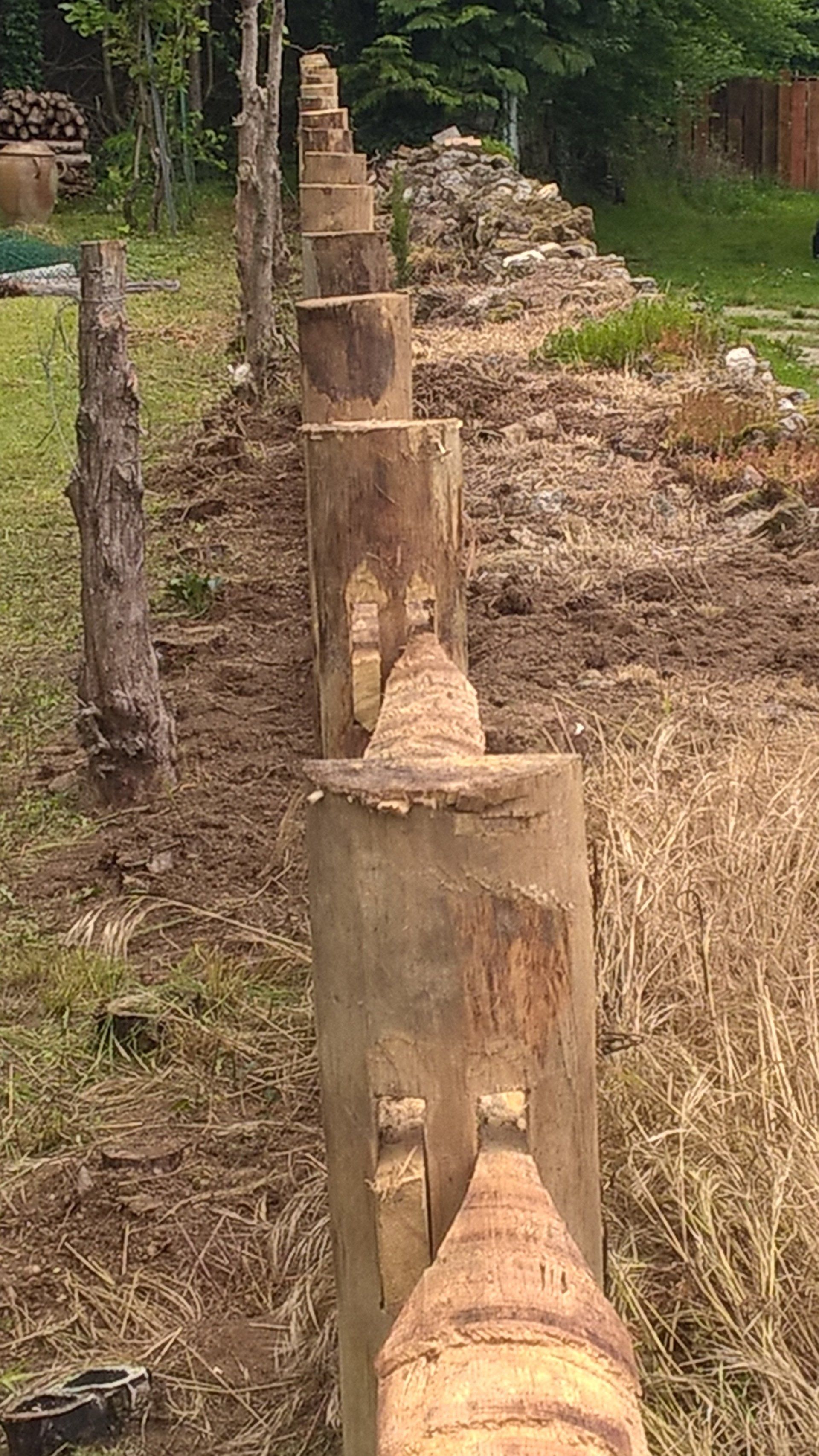 - Répétez, creusez un trou bien profond. Posez le poteau dans le trou légèrement incliné pour que la lisse puisse facilement entrer.