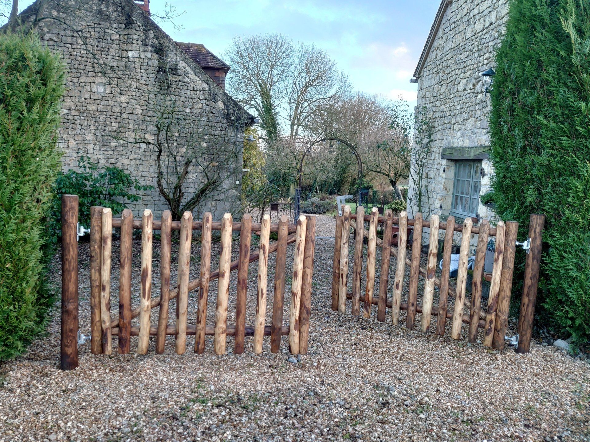 avec les ganivelles ou une clôture naturelle. La largeur de demi rondin est 6-8 cm et l'écartement aussi 6-8 cm.